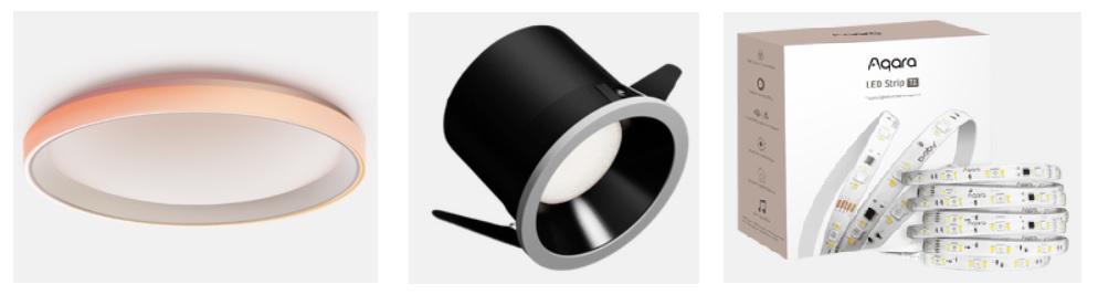 而Aqara有出雙色溫調整燈具,像是吸頂燈,筒射燈(崁燈),或支援RGB調整彩色的燈條,都是可以導入的選擇。