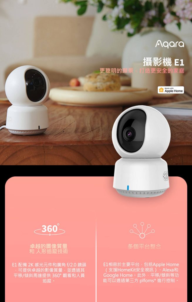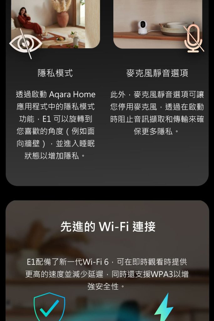 Aqara第一款純Wifi攝影機,雖然沒有網關功能,但攝影機功能一樣也沒少。針對隱私更精進的隱私模式和麥克風靜音選項。針對動作/聲音偵測的錄製,不錯過異常時刻紀錄。如果僅先想入手居家攝影機,E1絕對是好選擇。